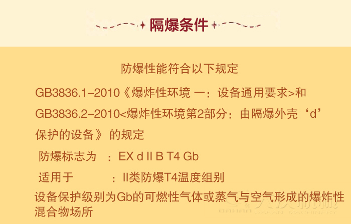 VBB系列防爆隔爆振動(dòng)電機(jī)的防爆性能符合GB3836.1-2010《爆炸性環(huán)境 一:設(shè)備通用要求>和GB3836.2-2010<爆炸性環(huán)境第2部分:由隔爆外殼‘d’保護(hù)的設(shè)備》 的規(guī)定,防爆標(biāo)志為EX d II B T4 Gb,適用于 II類(lèi)防爆T4溫度組別,設(shè)備保護(hù)級(jí)別為Gb的可燃性氣體或蒸氣與空氣形成的爆炸性混合物場(chǎng)所,其運(yùn)行條件在1區(qū)和2區(qū)內(nèi)均可運(yùn)行。